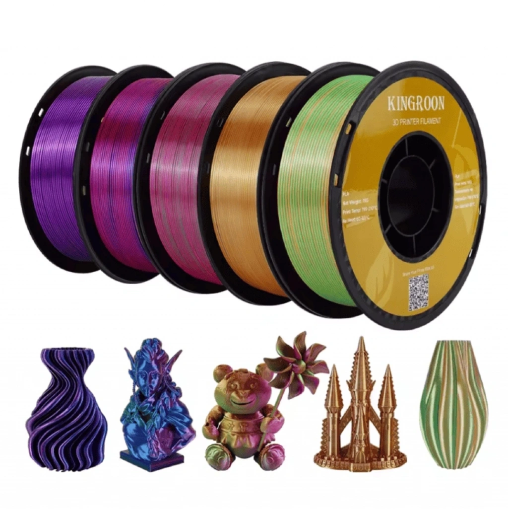 - 1 Adet Kingroon 3 Renk PLA Silk Filament Altın-Yeşil-Kırmızı&Mor 1.75 mm 1kg (Vakumlu Poşet)