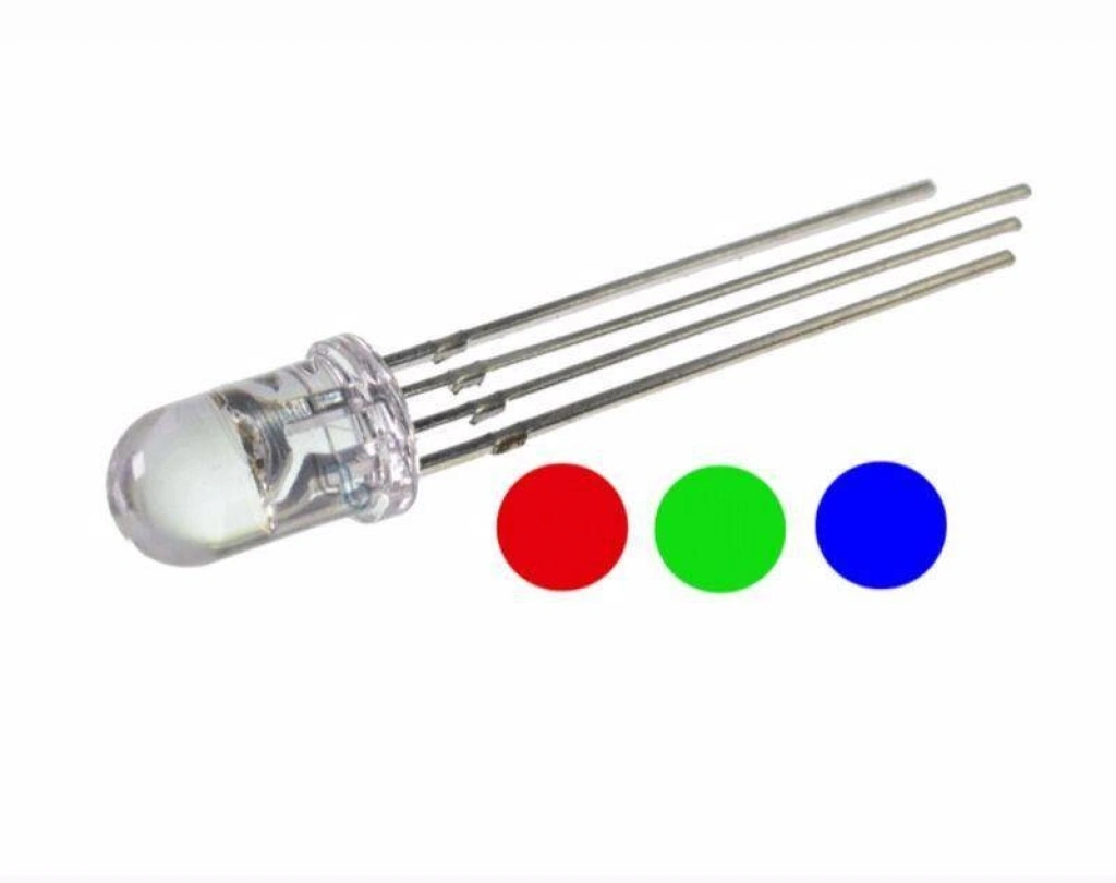 5mm RGB LED, Kırmızı, Yeşil ve Mavi renkleri tek bir pakette sunan, 4 bacaklı ve ortak katot bağlantılı yüksek kaliteli LED'dir. Renk karışımıyla milyonlarca renk üretilebilir ve elektronik projelerde geniş kullanım alanı bulur.