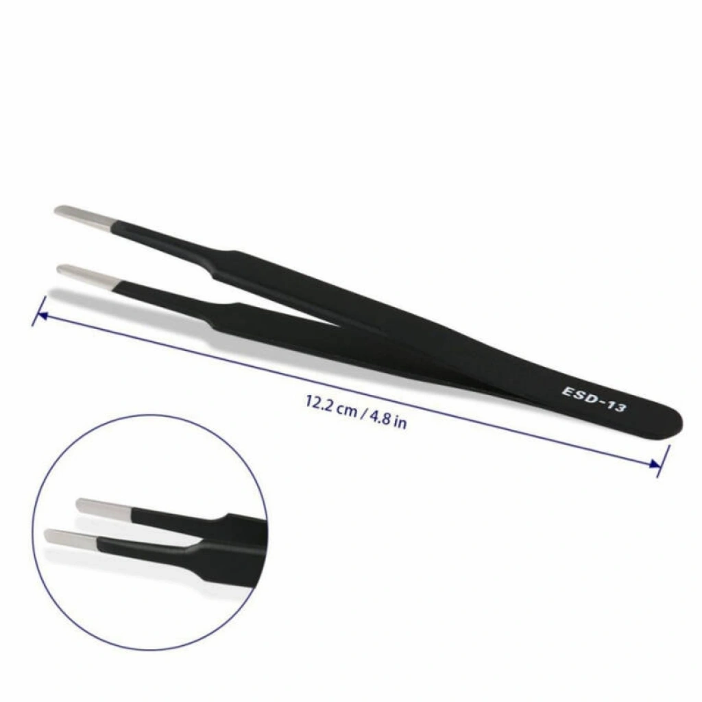 ESD-13 anti-statik cımbız, 120 mm uzunluğu ve kavisli ucu ile özellikle ulaşılması zor bölgelerdeki bileşenlerle çalışmak için idealdir. Elektronik devrelerde ESD (elektrostatik deşarj) riskine karşı güvenli kullanım sunar.