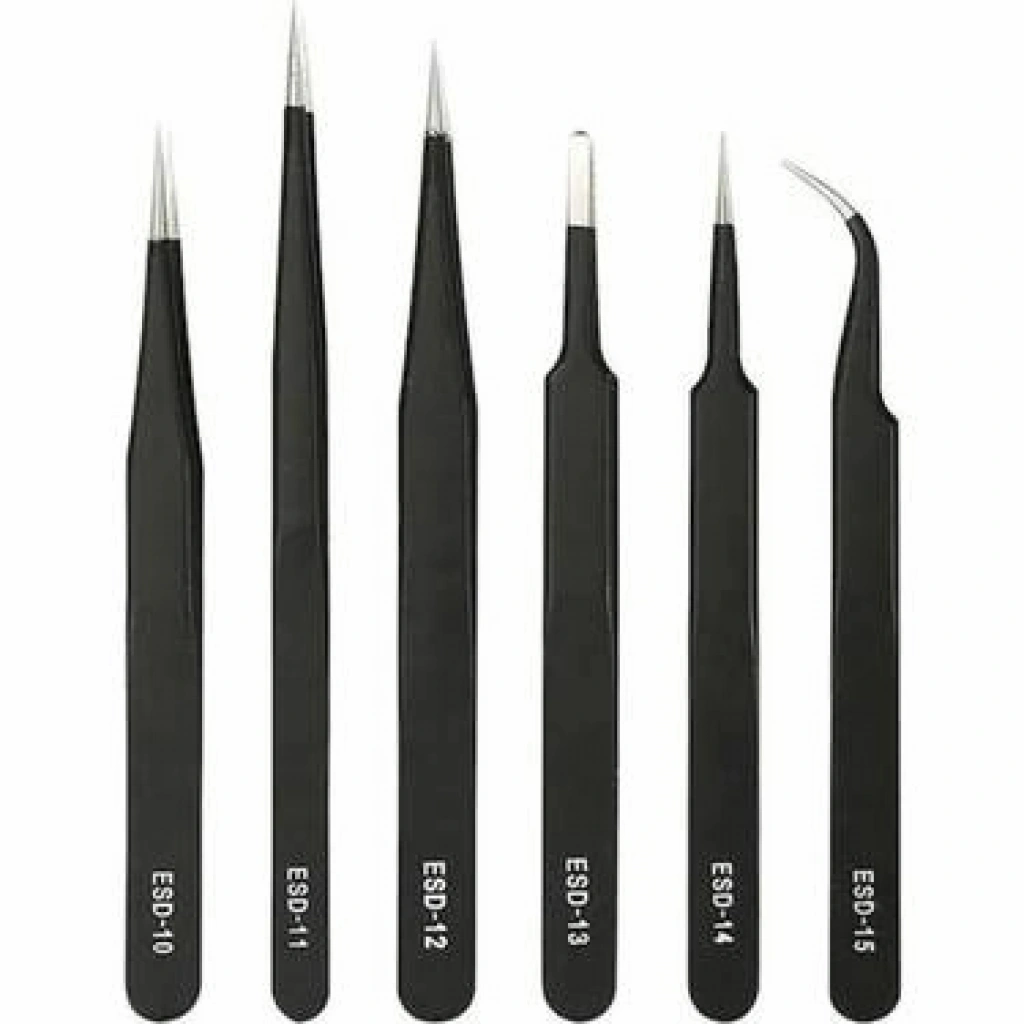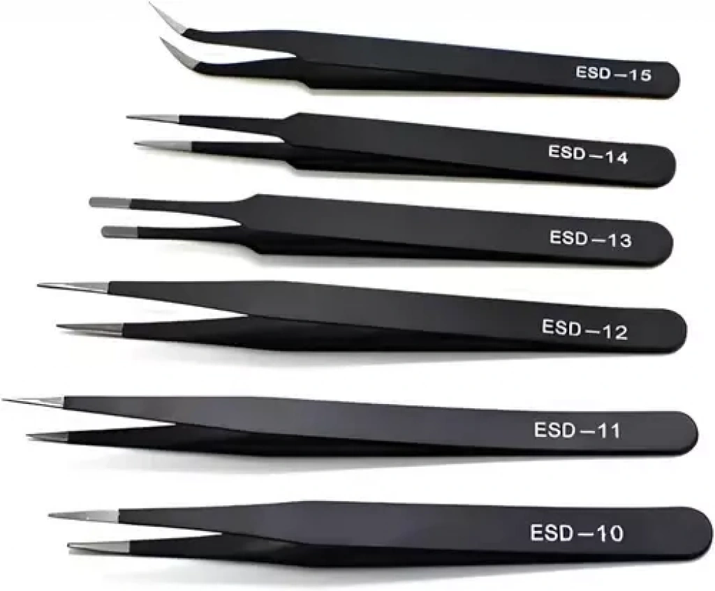 ESD cımbız seti, elektronik onarım, SMD montaj ve laboratuvar uygulamaları için özel olarak tasarlanmış 6 farklı uç tipine sahip anti-statik cımbızdan oluşur. ESD kaplamalı yapıları sayesinde hassas bileşenlerin statik elektrikten zarar görmesini engeller.